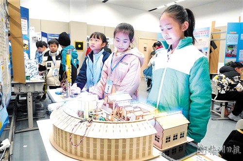 興寧市坭陂中心小學(xué)學(xué)生展示“圍龍屋演奏會(huì)”科創(chuàng)作品。(吳海清 攝)