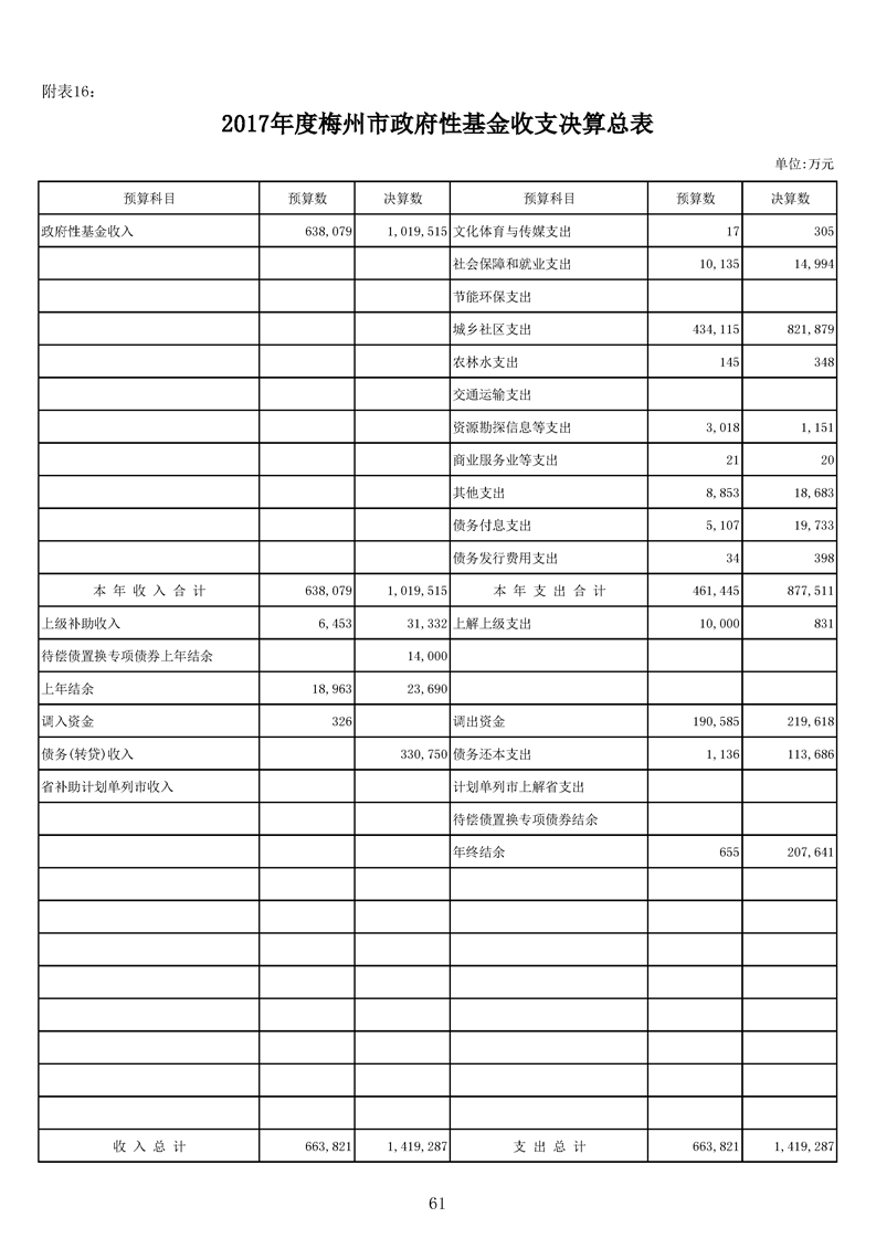 梅州市人民政府門戶網(wǎng)站 梅州市財政局 2017年度 附表16:2017年梅州市基金收支總表