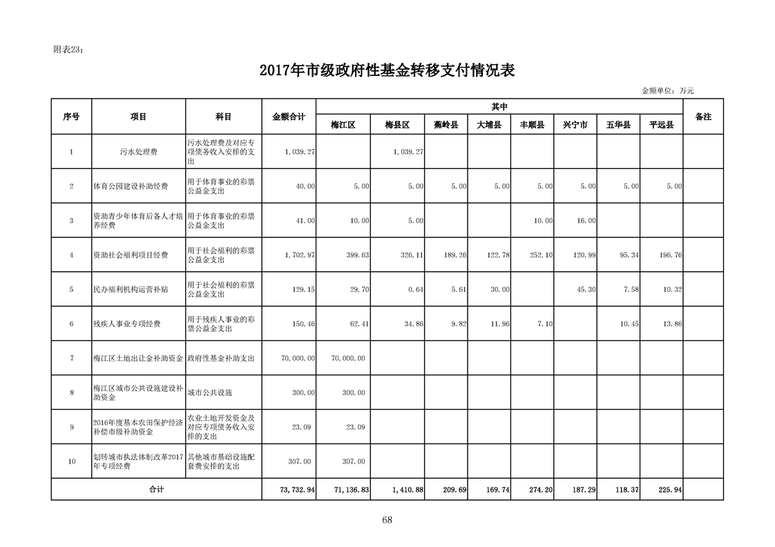 梅州市人民政府門戶網(wǎng)站 梅州市財(cái)政局 2017年度 附表23:2017年度市級(jí)政府性基金轉(zhuǎn)移支付情況表