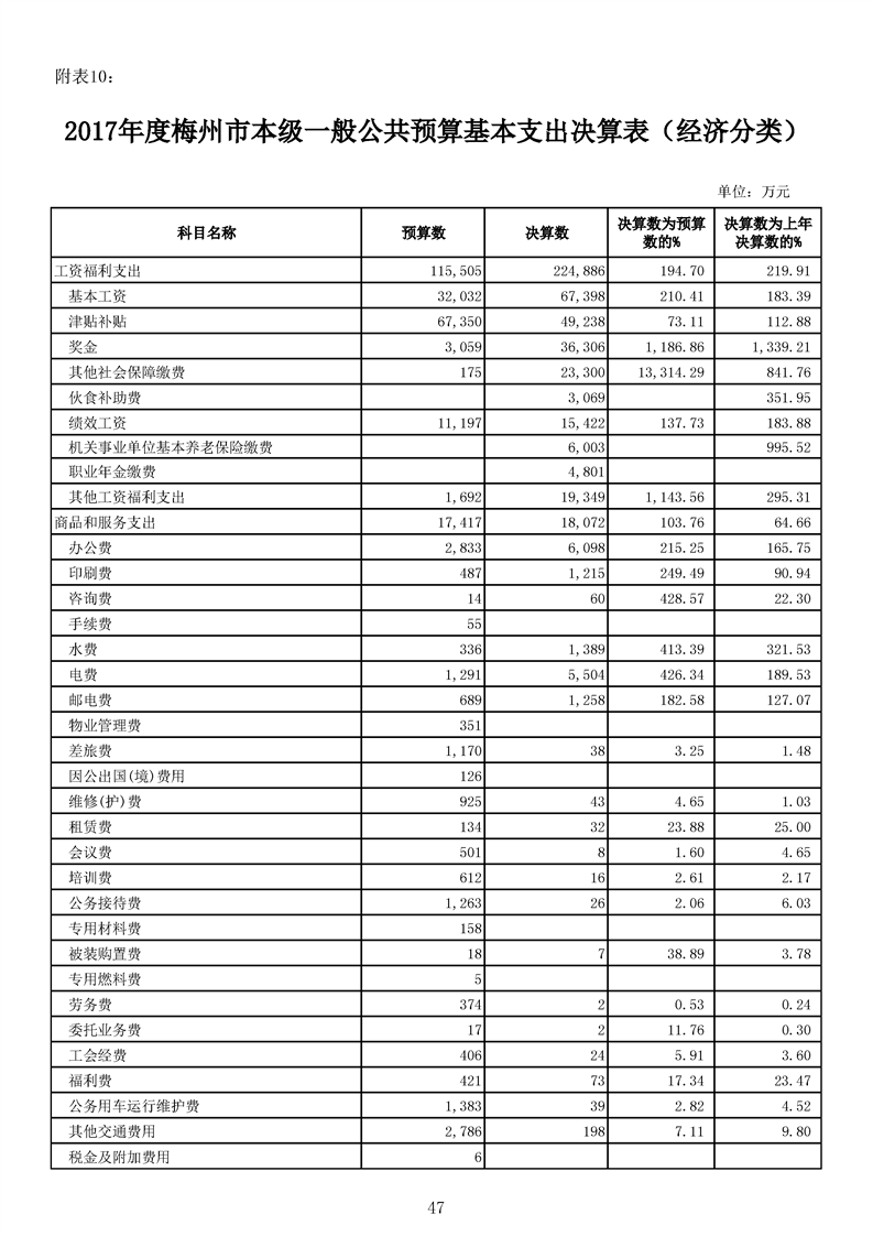 梅州市人民政府門戶網站 梅州市財政局 2017年度 附表10:2017年度市本級一般公共預算基本支出決算表(經濟分類)