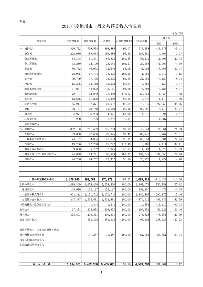 (附表1)2018年度梅州市一般公共預(yù)算收入情況表