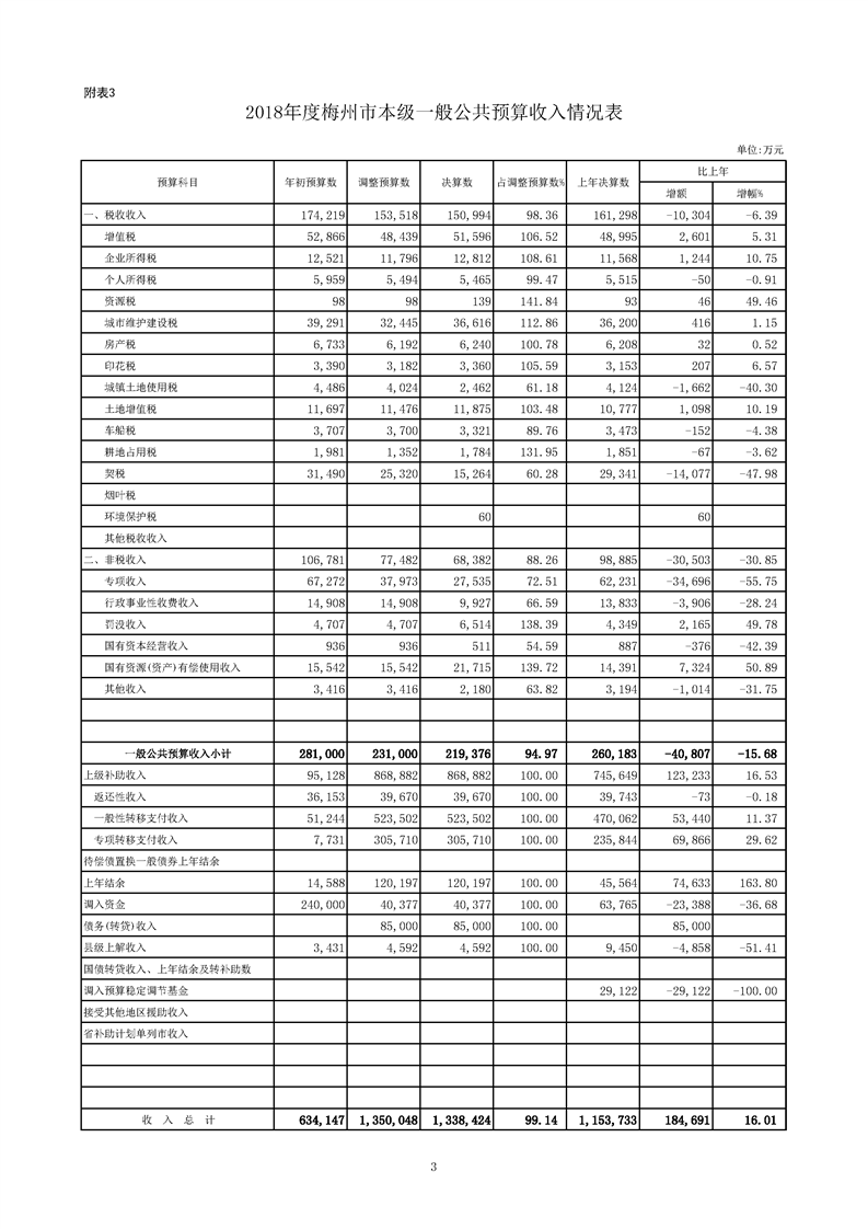 梅州市人民政府門戶網(wǎng)站 梅州市財政局 2018年度 (附表3)2018年度市本級一般公共預(yù)算收入情況表