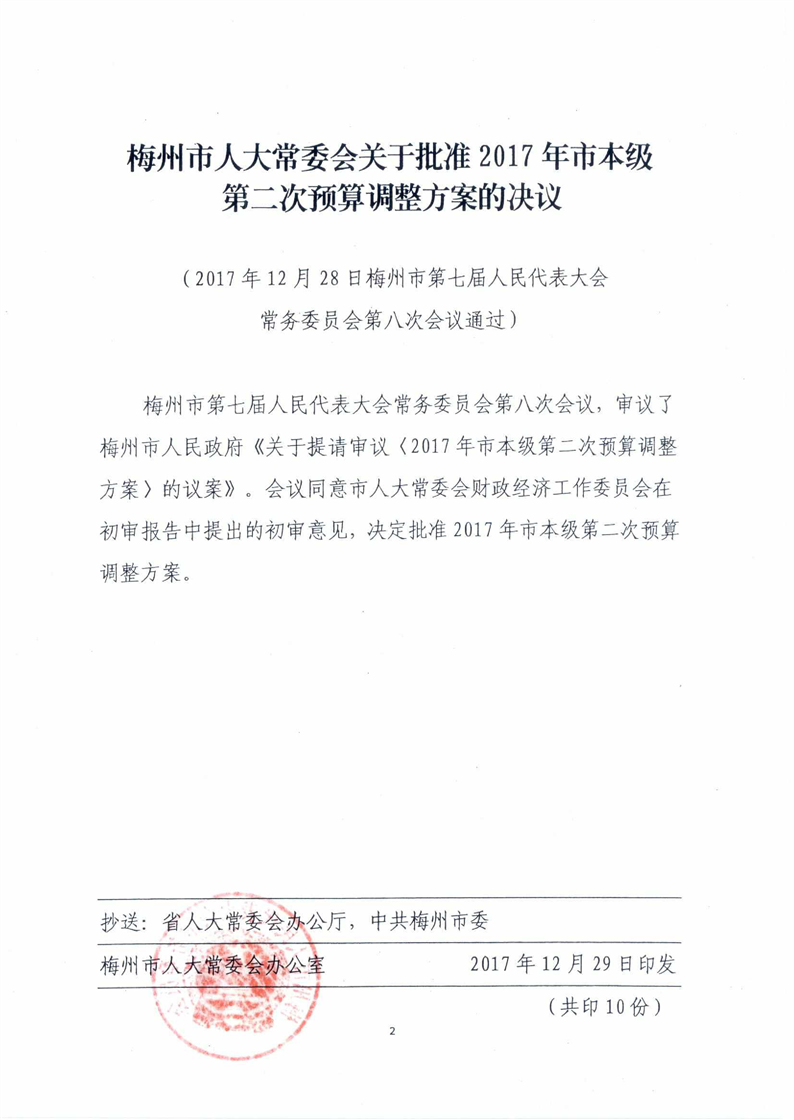 關于印發(fā)《梅州市人大常委會關于批準2017年市本級第二次預算調(diào)整方案的決議》的通知