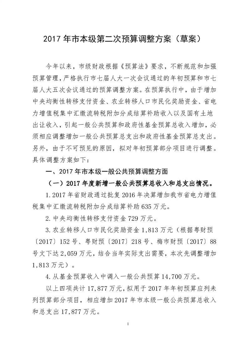 根據(jù)《中華人民共和國預算法》、《廣東省預算審批監(jiān)督條例》等法律法規(guī)的規(guī)定,為進一步規(guī)范和加強市本級預算管理,我們研究起草了《2017年市本級第二次預算調(diào)整方案》(草案),現(xiàn)向社會公開征求意見,公開征求意見截止日期為2017年12月13日。