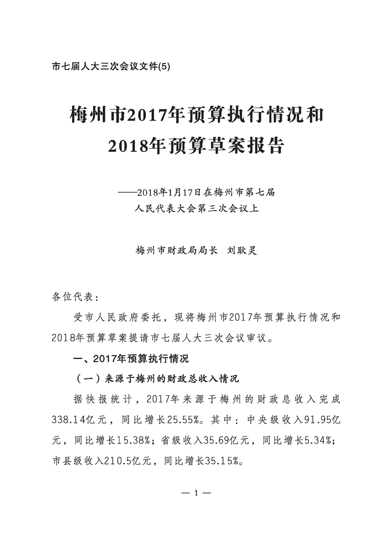 梅州市2017年預(yù)算執(zhí)行情況和2018年預(yù)算草案報告