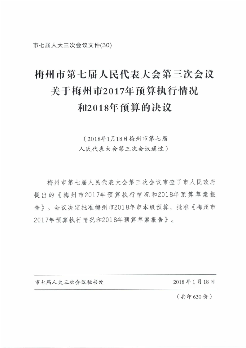 梅州市第七屆人民代表大會(huì)第三次會(huì)議梅州市2017年預(yù)算執(zhí)行情況和2018年預(yù)算的決議