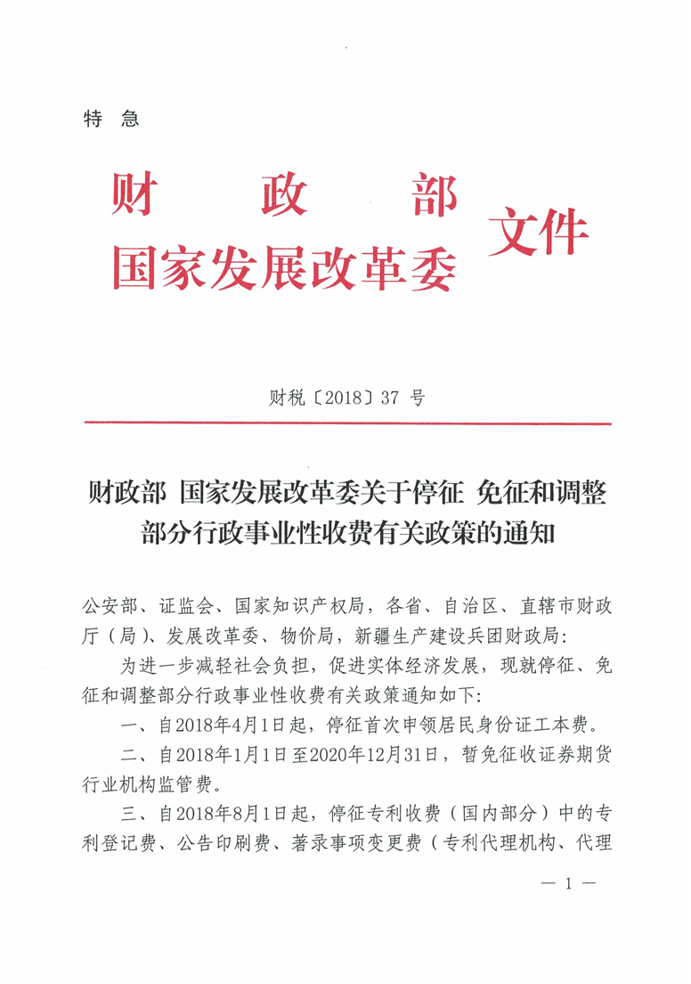 財(cái)政部 國(guó)家發(fā)展改革委關(guān)于停征 免征和調(diào)整部分行政事業(yè)性收費(fèi)有關(guān)政策的通知(財(cái)稅〔2018〕37號(hào))