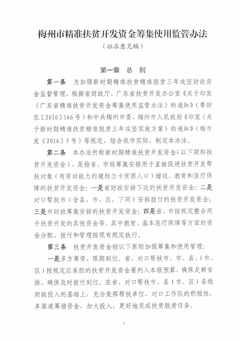 梅州市人民政府門戶網(wǎng)站 梅州市財政局 部門文件 關于征求梅州市精準扶貧開發(fā)資金籌集使用監(jiān)管辦法(征求意見稿)意見的通知