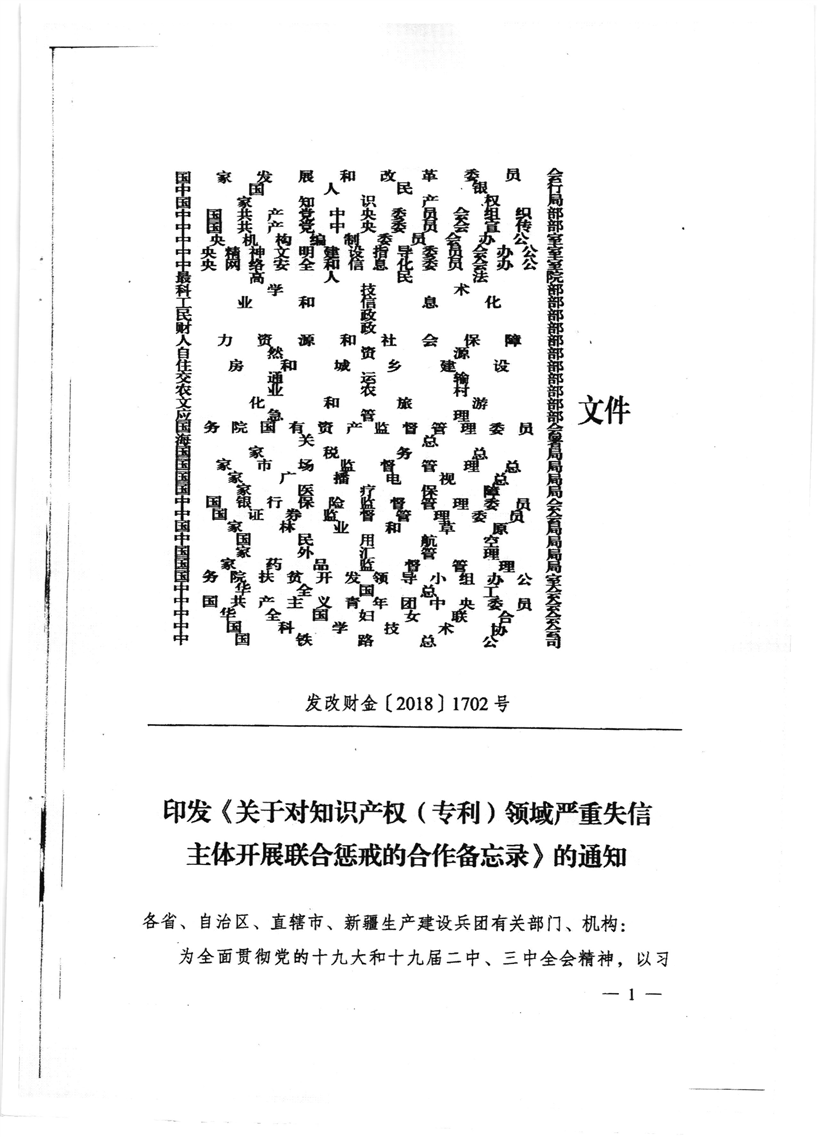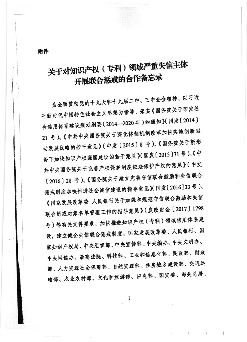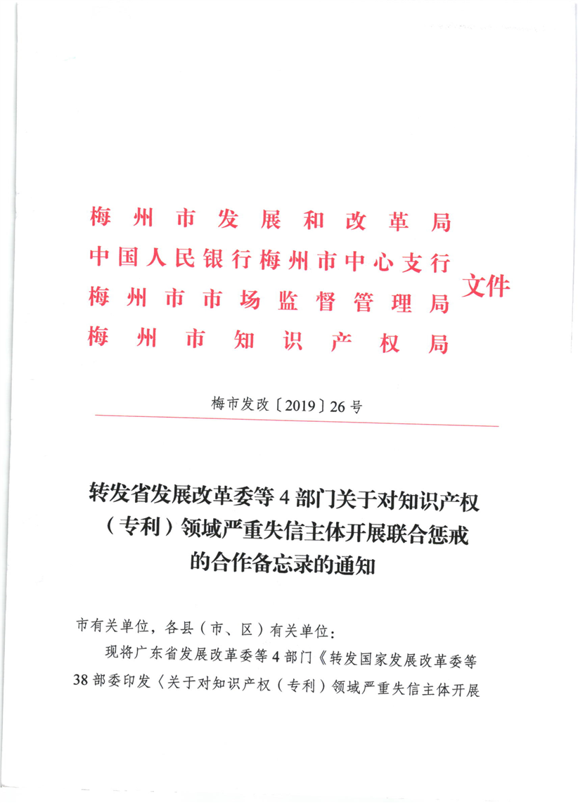 梅州市人民政府門戶網(wǎng)站 梅州市發(fā)展和改革局 相關政策 轉發(fā)省發(fā)展改革委等4部門關于知識產(chǎn)權(專利)領域嚴重失信主體開展聯(lián)合懲戒的合作備忘錄的通知