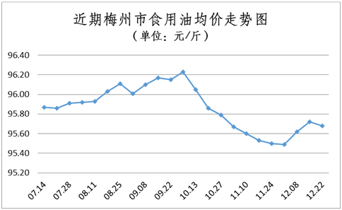 糧油價格基本穩(wěn)定。本周糧食均價為3.16元/斤,環(huán)比(與12月15日相比,下同)持平;食用油均價為95.68元/桶(5L),環(huán)比下降0.04%。