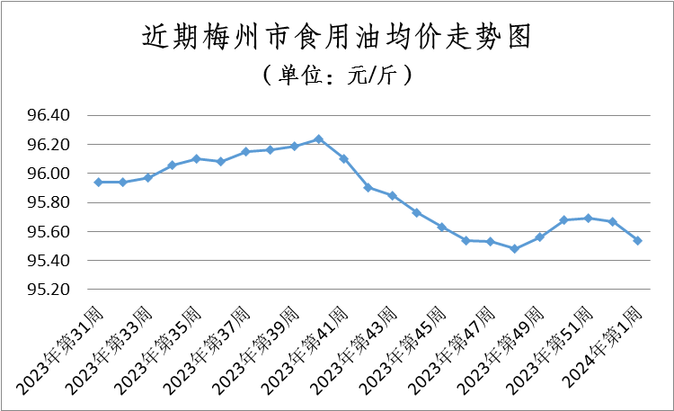 糧油價格穩(wěn)中有降。本周糧食均價為3.16元/斤,環(huán)比(與2023年第52周相比,下同)持平;食用油均價為95.54元/桶(5L),環(huán)比下降0.14%。