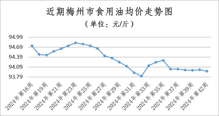 糧油價(jià)格保持穩(wěn)定。本周糧食均價(jià)為3.22元/斤,環(huán)比(與2024年第41周相比,下同)持平;食用油均價(jià)為93.96元/桶(5L),環(huán)比微降0.05%。