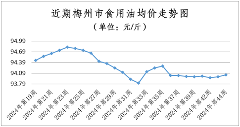 糧油價(jià)格保持穩(wěn)定。本周糧食均價(jià)為3.22元/斤,環(huán)比(與2024年第43周相比,下同)持平;食用油均價(jià)為94.04元/桶(5L),環(huán)比微升0.05%。