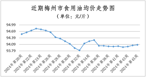 糧油價(jià)格保持穩(wěn)定。本周糧食均價(jià)為3.22元/斤,環(huán)比(與2024年第44周相比,下同)持平;食用油均價(jià)為94.07元/桶(5L),環(huán)比微升0.03%。