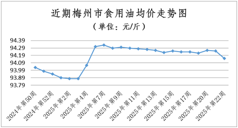 糧油價格基本穩(wěn)定。本周糧食均價為3.22元/斤,環(huán)比(與2025年第21周相比,下同)持平;食用油均價為94.15元/桶(5L),環(huán)比微降0.11%。