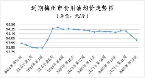 糧油價(jià)格基本穩(wěn)定。本周糧食均價(jià)為3.22元/斤,環(huán)比(與2025年第22周相比,下同)持平;食用油均價(jià)為94.05元/桶(5L),環(huán)比微降0.11%。