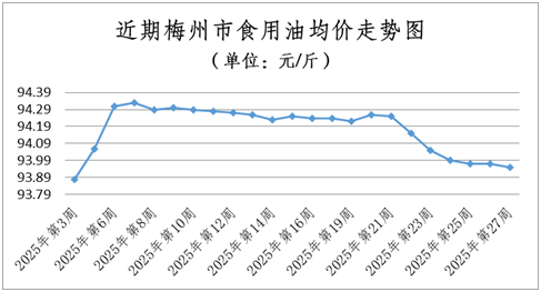 糧油價(jià)格基本穩(wěn)定。本周糧食均價(jià)為3.22元/斤,環(huán)比(與2025年第26周相比,下同)持平;食用油均價(jià)為93.95元/桶(5L),環(huán)比微降0.02%。