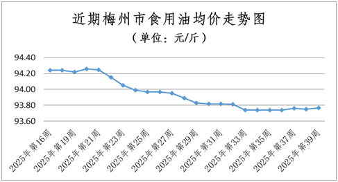 糧油價(jià)格基本穩(wěn)定。本周糧食均價(jià)為3.22元/斤,環(huán)比(與2025年第38周相比,下同)持平;食用油均價(jià)為93.77元/桶(5L),環(huán)比微漲0.02%。