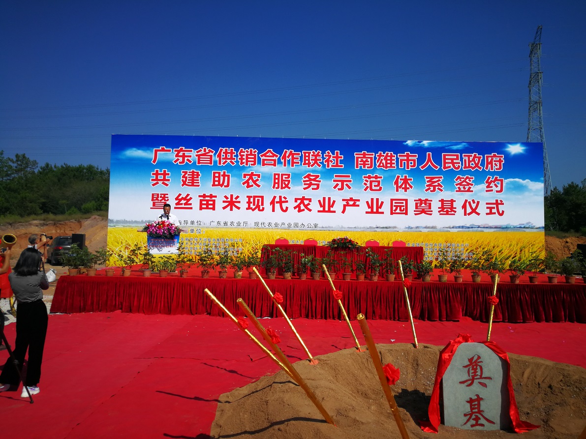 9月30日上午,省供銷社與南雄市政府共建助農(nóng)服務示范體系簽約暨絲苗米現(xiàn)代農(nóng)業(yè)產(chǎn)業(yè)園奠基儀式在南雄市珠璣鎮(zhèn)舉行。省社黨組成員、理事會副主任陳容秋,南雄市委副書記、市長林小龍出席儀式并致辭。