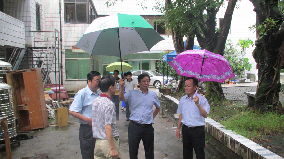 省供銷社陳棟副主任(右一)在市社領(lǐng)導(dǎo)班子成員的陪同下冒雨察看原市財(cái)貿(mào)學(xué)校