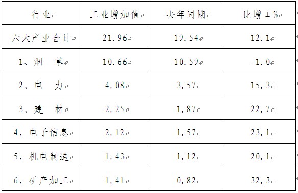 (四)支柱產(chǎn)業(yè)的支撐作用明顯。1-2月,我市六大支柱產(chǎn)業(yè)完成工業(yè)總產(chǎn)值63.56億元,同比增長(zhǎng)16.5%,占全市規(guī)模以上工業(yè)總產(chǎn)值的85%。工業(yè)增加值21.96億元,同比增長(zhǎng)12.1%,高于全市增速1.4個(gè)百分點(diǎn),對(duì)全市工業(yè)增長(zhǎng)貢獻(xiàn)率達(dá)94.2%,拉動(dòng)工業(yè)增長(zhǎng)10個(gè)百分點(diǎn)。(見(jiàn)下表)