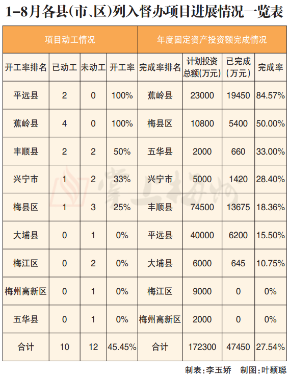 與1-7月督查通報(bào)的數(shù)據(jù)相比,全市無新增動(dòng)工項(xiàng)目。從年度固定資產(chǎn)投資額完成情況看,蕉嶺縣繼續(xù)保持全市第一位,1-7月完成投資額19450萬元,完成率由81.30%增加到84.57%。完成率增加的還有梅縣區(qū)、興寧市、豐順縣、平遠(yuǎn)縣、五華縣、大埔縣,梅縣區(qū)由26.74%增加至50%,興寧市由24.40%增加至28.40%,豐順縣由18.13%增加至18.36%,平遠(yuǎn)縣由7.25%增加至15.50%,五華縣由6.50%增加至33%,大埔縣固投額“破0”,已完成投資645萬元,完成率為10.75%。梅江區(qū)、梅州高新區(qū)完成率依舊為0%。