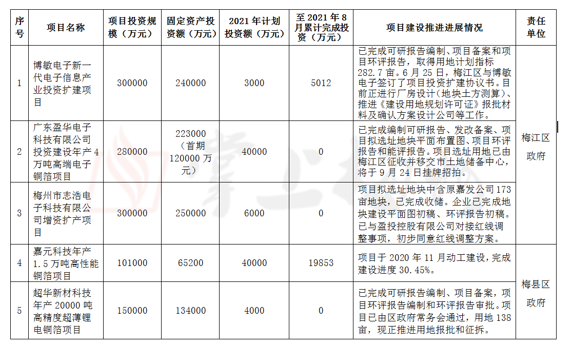 5個(gè)項(xiàng)目中已動(dòng)工的有嘉元科技年產(chǎn)1.5萬噸高性能銅箔項(xiàng)目,正在推進(jìn)前期工作的有博敏電子新一代電子信息產(chǎn)業(yè)擴(kuò)建項(xiàng)目、廣東盈華電子科技有限公司投資建設(shè)年產(chǎn)4萬噸高端電子銅箔項(xiàng)目、梅州市志浩電子科技有限公司增資擴(kuò)產(chǎn)項(xiàng)目、超華科技年產(chǎn)2萬噸高精度超薄鋰電銅箔項(xiàng)目等4個(gè)項(xiàng)目。嘉元科技年產(chǎn)1.5萬噸高性能銅箔項(xiàng)目至8月累計(jì)完成投資19853萬元,比1-7月增加4860萬元,項(xiàng)目完成建設(shè)進(jìn)度為30.45%。