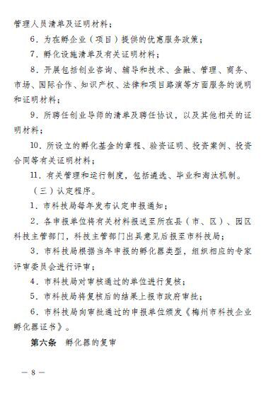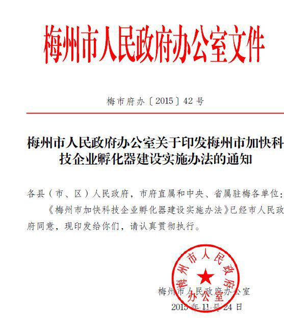 梅州市人民政府門戶網(wǎng)站 梅州市科學(xué)技術(shù)局 政策法規(guī) (已失效)梅州市人民政府辦公室印發(fā)《梅州市加快科技企業(yè)孵化器建設(shè)實(shí)施辦法》