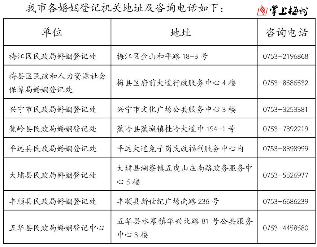 據(jù)悉,除了平遠縣、豐順縣、蕉嶺縣平常周六上午不辦理婚姻登記業(yè)務外,其他縣市區(qū)均可辦理。