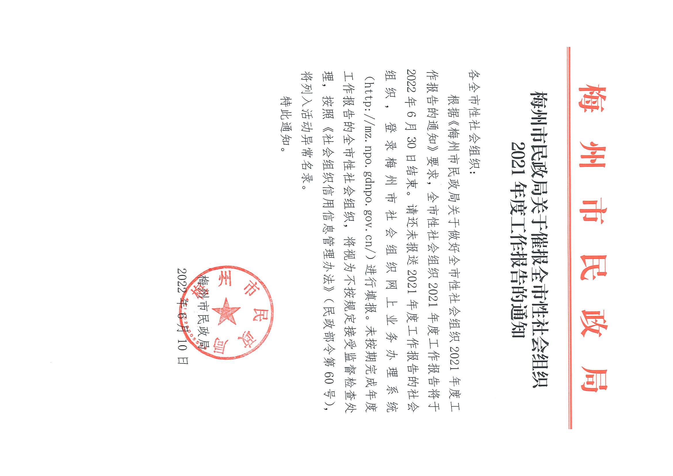 梅州市人民政府門戶網(wǎng)站 梅州市民政局 通知公告 梅州市民政局關(guān)于催報全市性社會組織2021年度報告工作的通知