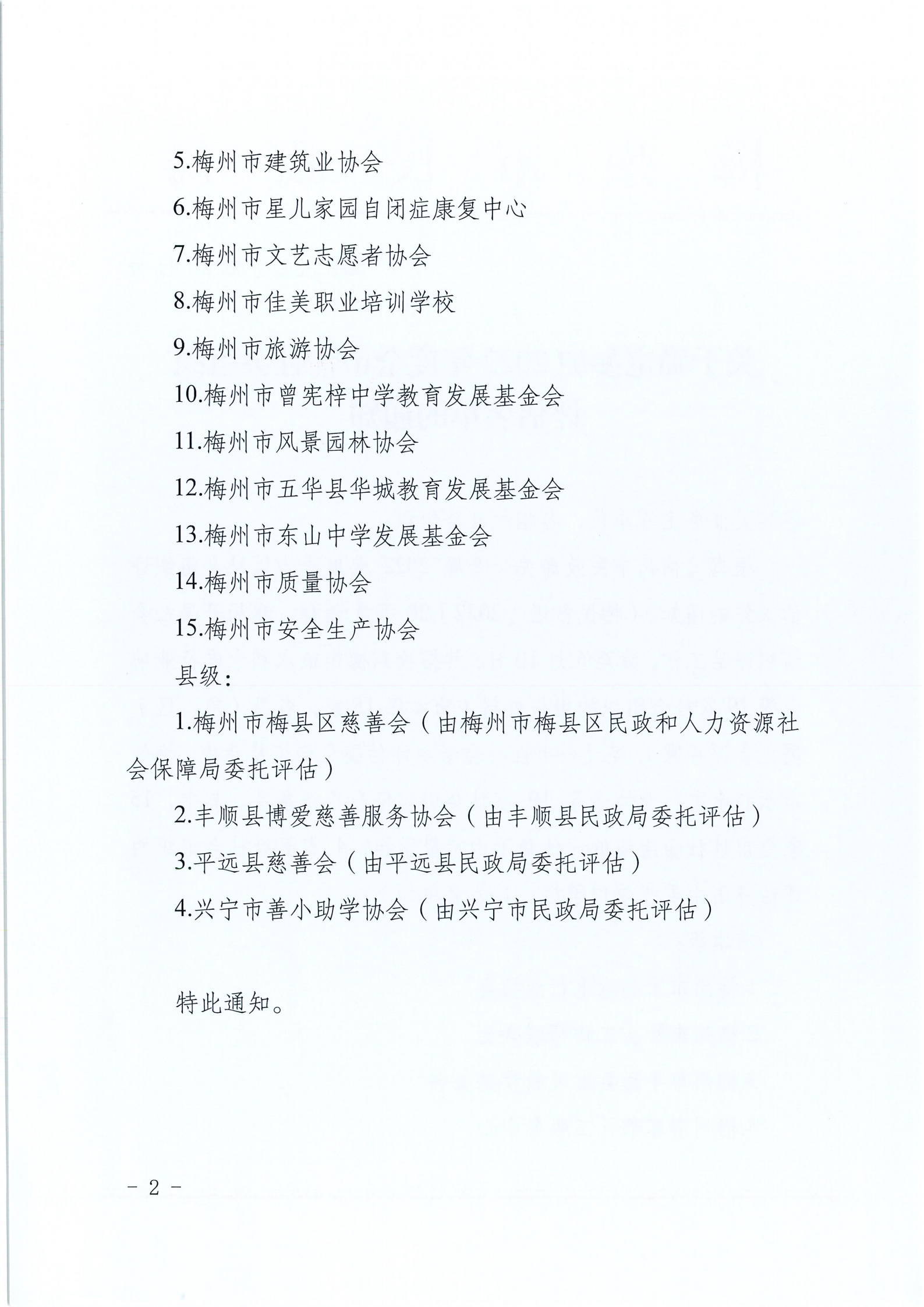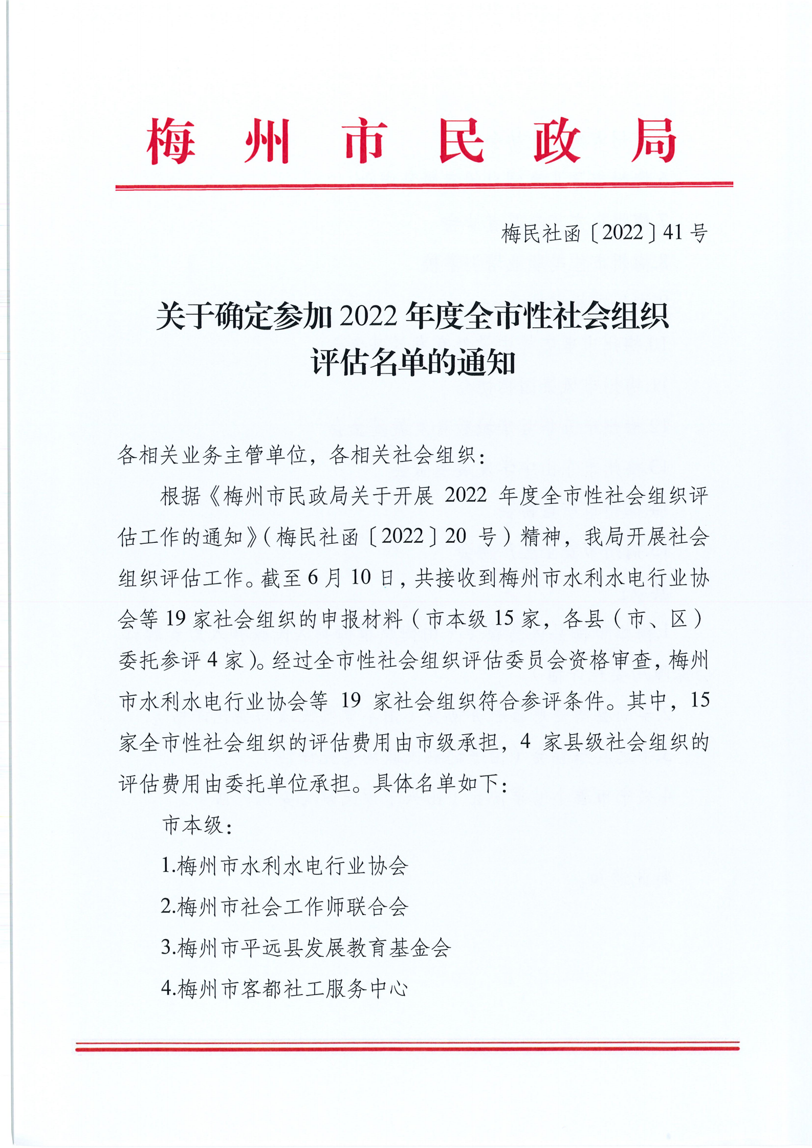 梅州市人民政府門戶網(wǎng)站 梅州市民政局 通知公告 關(guān)于確定參加2022年度全市性社會組織評估名單的通知