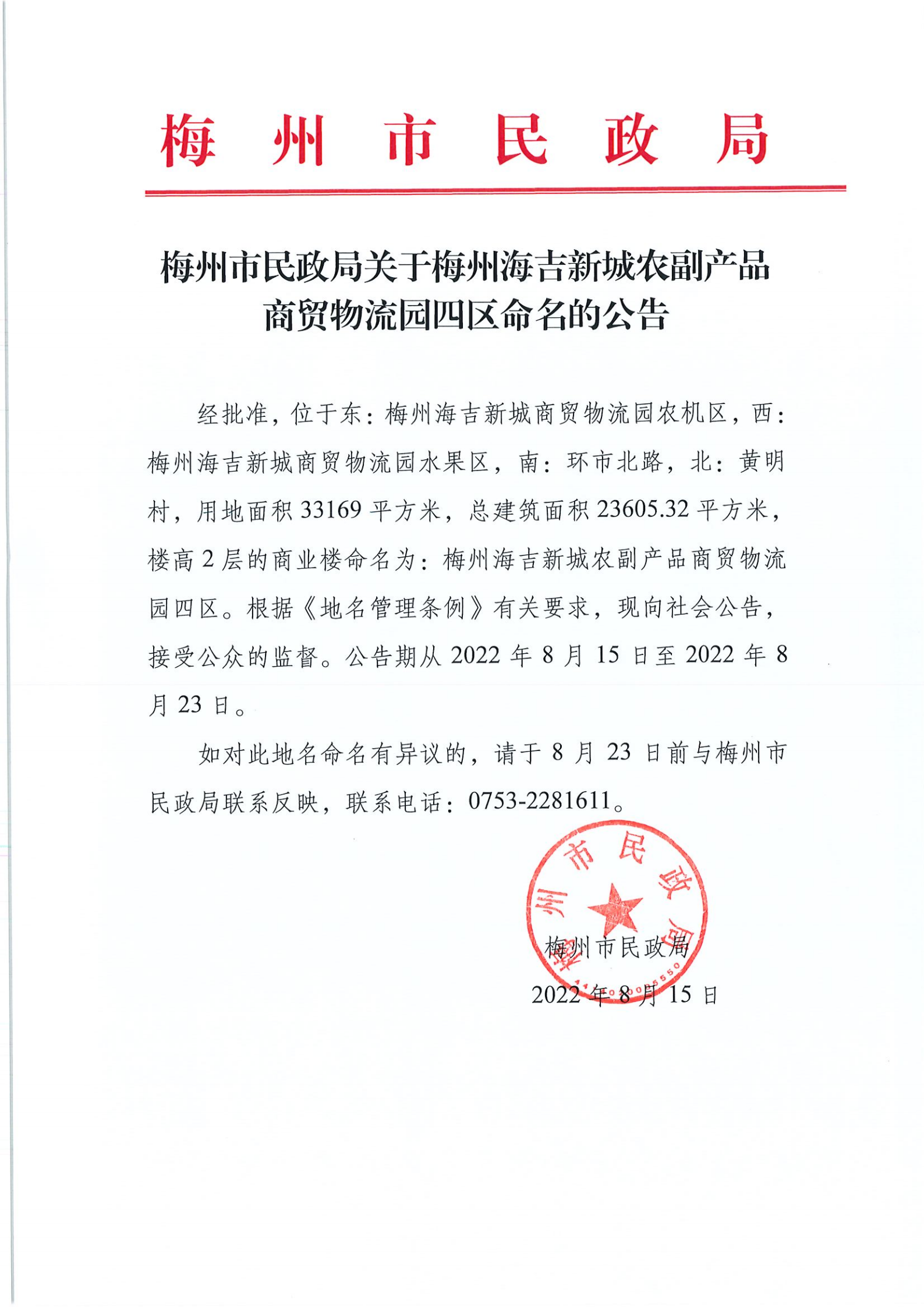 梅州市民政局關(guān)于梅州海吉新城農(nóng)副產(chǎn)品商貿(mào)物流園四區(qū)命名的公告