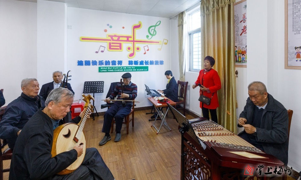 在梅縣區(qū)新城辦事處老年人活動中心,老人在音樂室演奏漢樂。(林翔 攝)