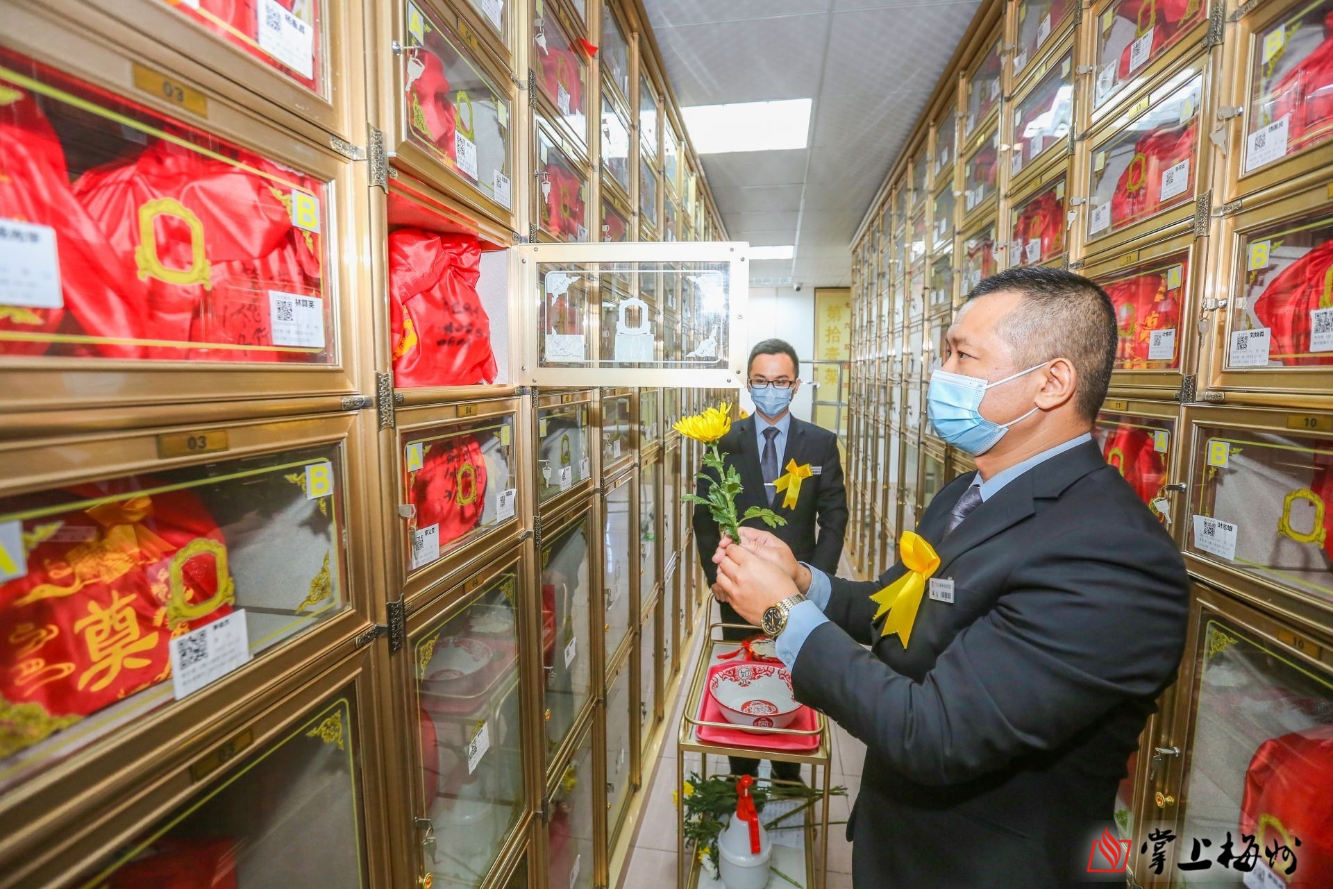 記者在現(xiàn)場看到,儀式結(jié)束后,工作人員一行來到骨灰寄存處,擦拭骨灰寄存柜,對骨灰格位鞠躬行禮,獻上一束菊花,并貼上家屬對逝者飽含思念和愛意的寄語。