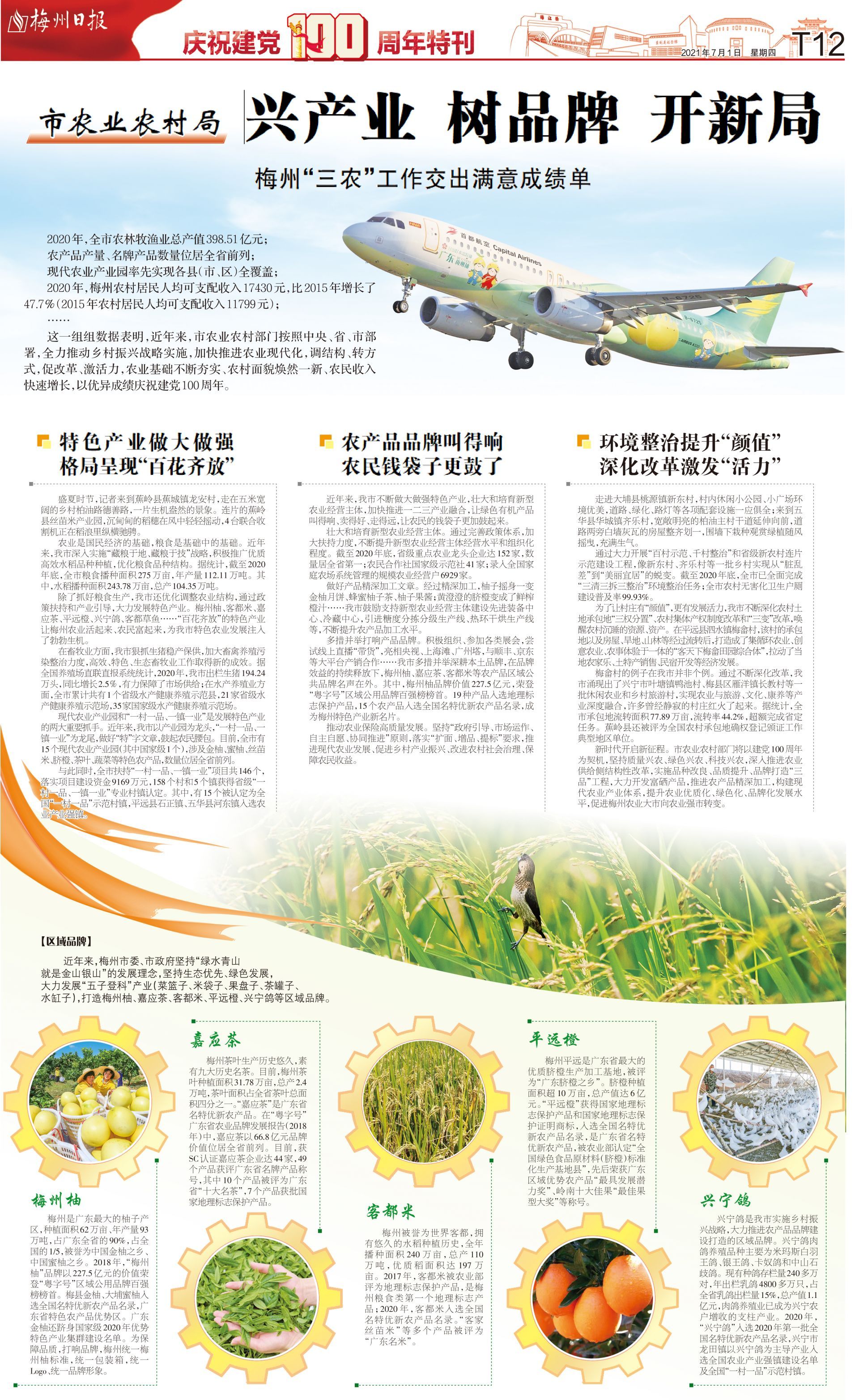 2020年,全市農(nóng)林牧漁業(yè)總產(chǎn)值398.51億元; 農(nóng)產(chǎn)品產(chǎn)量、名牌產(chǎn)品數(shù)量位居全省前列; 現(xiàn)代農(nóng)業(yè)產(chǎn)業(yè)園率先實(shí)現(xiàn)各縣(市、區(qū))全覆蓋; 2020年,梅州農(nóng)村居民人均可支配收入17430元,比2015年增長(zhǎng)了47.7%(2015年農(nóng)村居民人均可支配收入11799元); …… 這一組組數(shù)據(jù)表明,近年來(lái),市農(nóng)業(yè)農(nóng)村部門(mén)按照中央、省、市部署,全力推動(dòng)鄉(xiāng)村振興戰(zhàn)略實(shí)施,加快推進(jìn)農(nóng)業(yè)現(xiàn)代化,調(diào)結(jié)構(gòu)、轉(zhuǎn)方式,促改革、激活力,農(nóng)業(yè)基礎(chǔ)不斷夯實(shí)、農(nóng)村面貌煥然一新、農(nóng)民收入快速增長(zhǎng),以?xún)?yōu)異成績(jī)慶祝建黨100周年。