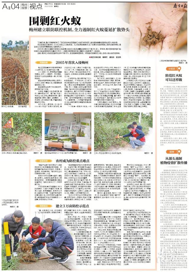 除了會對人造成傷害外,紅火蟻取食多種作物的種子、根部、果實(shí)等,影響農(nóng)業(yè)生產(chǎn),導(dǎo)致農(nóng)作物減產(chǎn),破壞生態(tài)結(jié)構(gòu)。作為農(nóng)業(yè)大市,梅州不得不防。