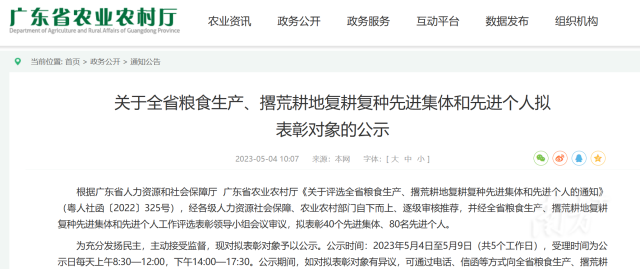 5月4日,廣東省農(nóng)業(yè)農(nóng)村廳官網(wǎng)發(fā)布公告,全省糧食生產(chǎn)、撂荒耕地復(fù)耕復(fù)種先進(jìn)集體和先進(jìn)個(gè)人擬表彰對(duì)象正在公示,擬表彰40個(gè)先進(jìn)集體、80名先進(jìn)個(gè)人。其中,梅州4個(gè)集體、5名個(gè)人入選名單。