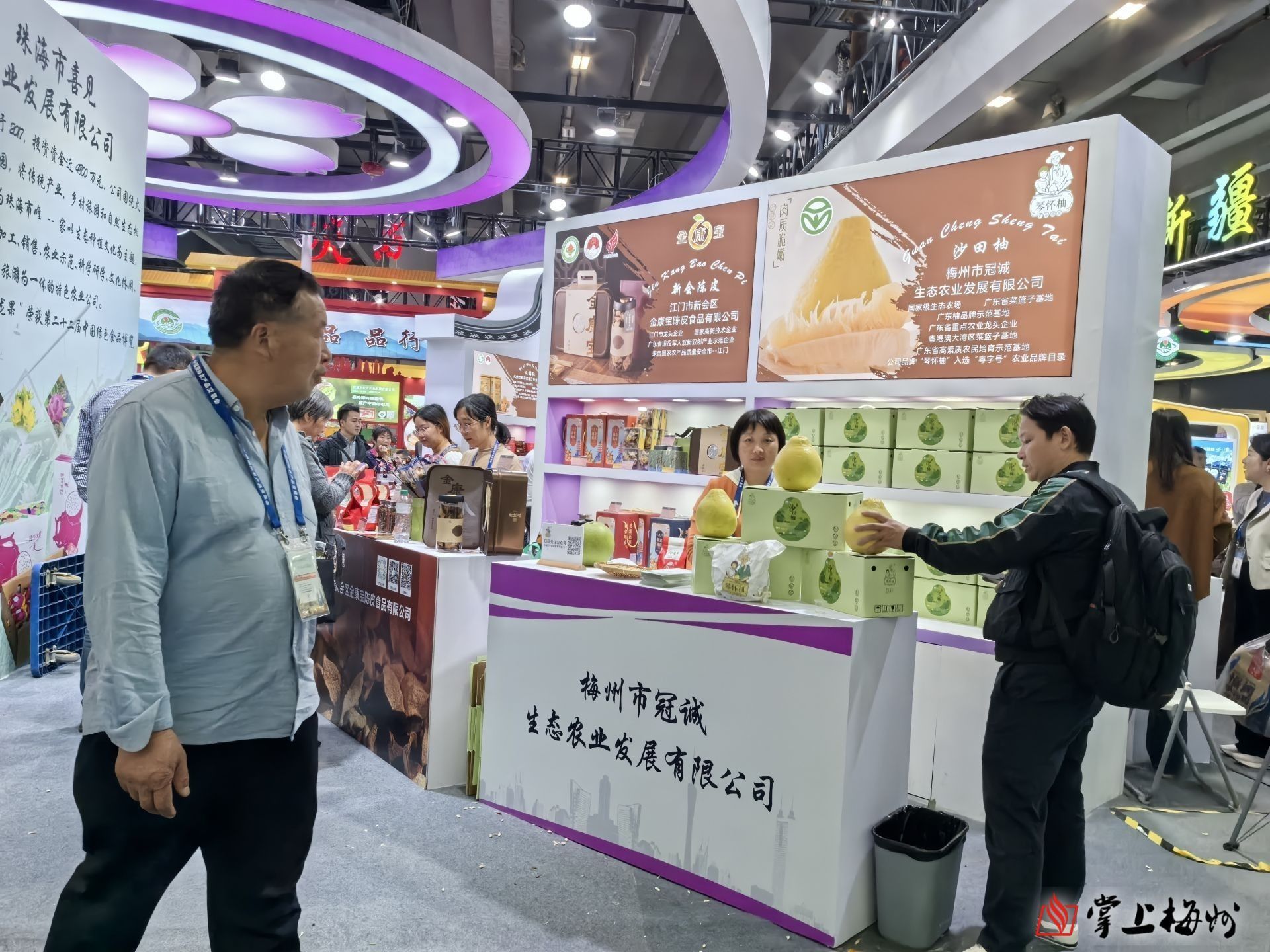 為了更好地推介我市農(nóng)特產(chǎn)品,打響梅州農(nóng)業(yè)品牌,梅州市農(nóng)業(yè)農(nóng)村局精心組織我市10多家農(nóng)業(yè)企業(yè)代表和單位參展,將梅州金柚、客家炒綠、鹽焗雞等梅州特色優(yōu)質(zhì)農(nóng)產(chǎn)品帶到展會現(xiàn)場。梅州市農(nóng)林科學(xué)院茶葉研究所、客都農(nóng)創(chuàng)(梅州)產(chǎn)業(yè)發(fā)展有限公司等單位和企業(yè)在廣東館梅州展區(qū)展出;廣東館廣東省綜合展區(qū)還設(shè)置了梅州柚專題展,展出了梅州金柚和柚子糖、柚甘等柚子加工品,以及金針菜、仙人粄、古法醬油等梅州特色農(nóng)產(chǎn)品。在綠色、有機、地標農(nóng)產(chǎn)品展區(qū)的廣東綠色優(yōu)質(zhì)農(nóng)產(chǎn)品館,梅州市冠誠生態(tài)農(nóng)業(yè)發(fā)展有限公司將綠色有機的梅州金柚帶到現(xiàn)場展出。