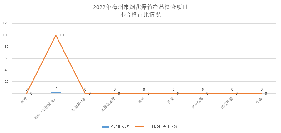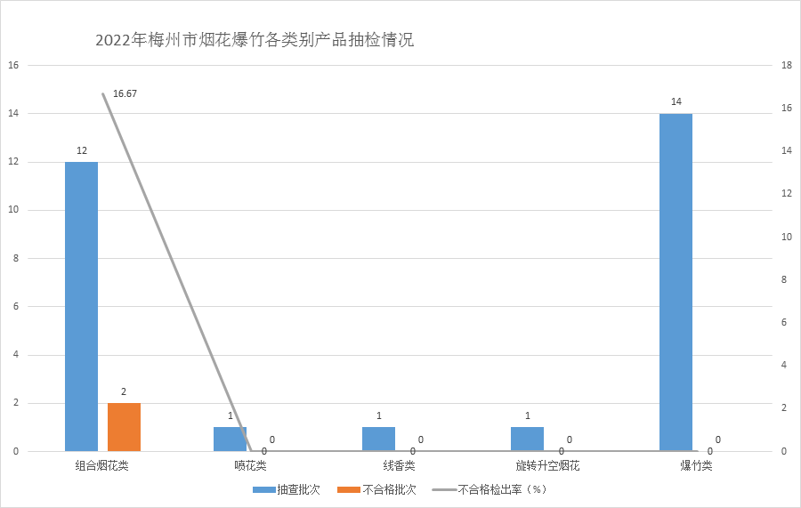 本次抽查的煙花爆竹產(chǎn)品主要類別有組合煙花類、噴花類、線香類、旋轉(zhuǎn)升空煙花、爆竹類等5大類別,2款不合格產(chǎn)品是組合煙花類,其他4類產(chǎn)品未發(fā)現(xiàn)不合格產(chǎn)品。組合煙花類共抽查12款,經(jīng)檢驗(yàn),發(fā)現(xiàn)2款產(chǎn)品不合格,不合格檢出率為16.67%。