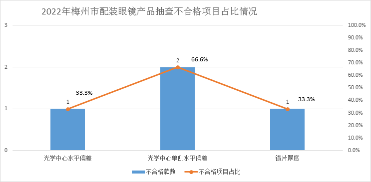 本次抽查重點(diǎn)對(duì)鏡架外觀質(zhì)量、鏡片表面質(zhì)量和內(nèi)在疵病、球鏡頂焦度、柱鏡頂焦度、棱鏡度、光學(xué)中心水平偏差、光學(xué)中心單側(cè)水平偏差、光學(xué)中心垂直互差、可見光透射比、紫外透射比、裝配質(zhì)量、標(biāo)志、鏡片厚度等14個(gè)項(xiàng)目進(jìn)行檢驗(yàn),其中主要不合格項(xiàng)目、款數(shù)及該項(xiàng)目不合格款數(shù)占該產(chǎn)品不合格總數(shù)比例分別為:光學(xué)中心水平偏差,1,33.3%;光學(xué)中心單側(cè)水平偏差,2,66.6%;鏡片厚度,1,33.3%。