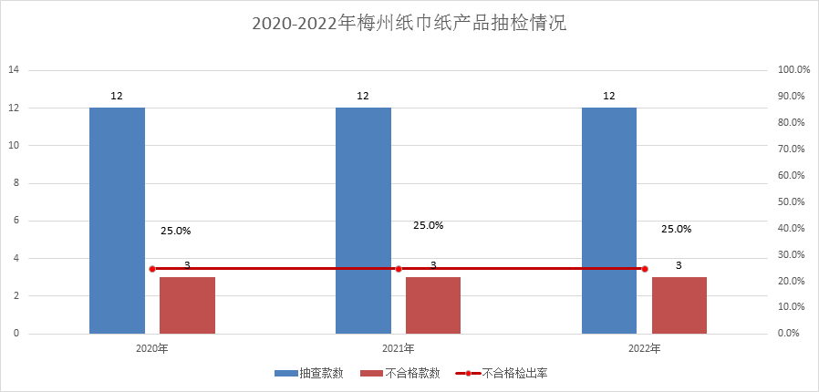 本次共對(duì)12家企業(yè)生產(chǎn)的12款紙巾紙產(chǎn)品進(jìn)行抽查檢驗(yàn),經(jīng)檢驗(yàn),發(fā)現(xiàn)3款產(chǎn)品不合格,不合格檢出率為25%。該類產(chǎn)品近三年不合格檢出率均為25%。