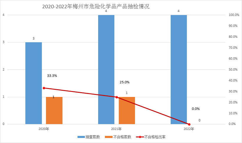 圖3 2020-2022年梅州市危險(xiǎn)化學(xué)品產(chǎn)品抽檢情況