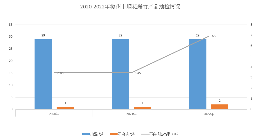 本次煙花爆竹產(chǎn)品抽查不合格檢出率為6.90%,該類產(chǎn)品2020年、2021年不合格檢出率均為3.45%。