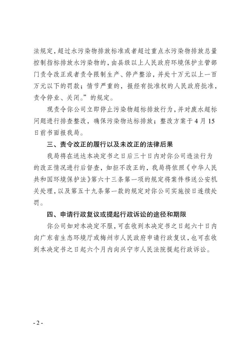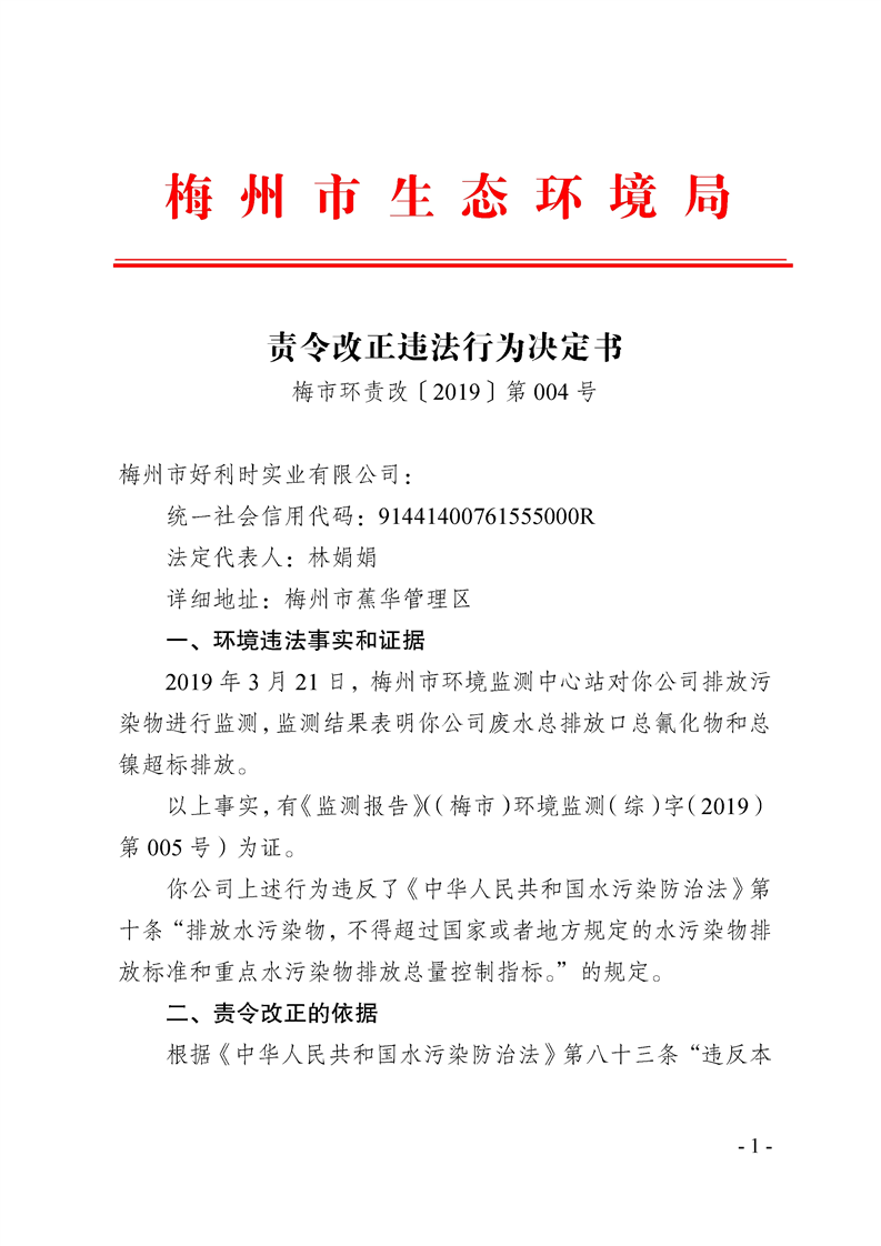 梅州市人民政府門戶網(wǎng)站 梅州市生態(tài)環(huán)境局 責(zé)令改正 梅市環(huán)責(zé)改〔2019〕第004號(hào)梅州市環(huán)境保護(hù)局責(zé)令改正違法行為決定書(梅州市好利時(shí)實(shí)業(yè)有限公司)