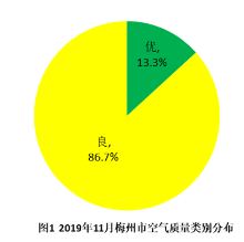 2019年11月份梅州市環(huán)境空氣質(zhì)量有效監(jiān)測天數(shù)30天,數(shù)據(jù)有效率100%。環(huán)境空氣質(zhì)量指數(shù)(AQI)范圍31~91,其中,空氣質(zhì)量優(yōu)的天數(shù)4天,良的天數(shù)26天,優(yōu)良率為100%,同比持平;首要污染物為NO2、PM10、O3、PM2.5;城市環(huán)境空氣質(zhì)量綜合指數(shù)為4.18,在全省21個(gè)地級市中排第6名。