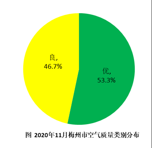 2020年11月份梅州市環(huán)境空氣質(zhì)量有效監(jiān)測天數(shù)30天。環(huán)境空氣質(zhì)量指數(shù)(AQI)范圍24~87,其中,空氣質(zhì)量優(yōu)的天數(shù)16天,良的天數(shù)14天,優(yōu)良率為100%,同比環(huán)比均持平;首要污染物有PM10(1天)、O3(11天)、PM2.5(1天)、NO2(1天);城市環(huán)境空氣質(zhì)量綜合指數(shù)為3.22,在全省21個地級市中排第4名。
