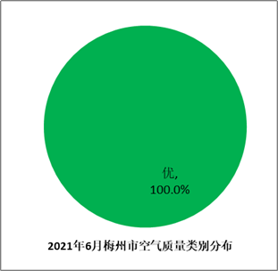 2021年6月份梅州市環(huán)境空氣質(zhì)量有效監(jiān)測(cè)天數(shù)30天。環(huán)境空氣質(zhì)量指數(shù)(AQI)范圍21~50,其中,空氣質(zhì)量?jī)?yōu)的天數(shù)30天,達(dá)標(biāo)率100%,同比持平,環(huán)比上升3.2個(gè)百分點(diǎn);城市環(huán)境空氣質(zhì)量綜合指數(shù)為1.81,在全省21個(gè)地級(jí)市中與汕尾市并列排第1名。