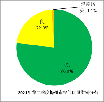 2021年第二季度梅州市環(huán)境空氣質(zhì)量有效監(jiān)測天數(shù)91天。環(huán)境空氣質(zhì)量指數(shù)(AQI)范圍21~113,其中,空氣質(zhì)量優(yōu)的天數(shù)為70天,良的天數(shù)20天,輕度污染1天,達標(biāo)率為98.9%,同比上升3.3個百分點。城市環(huán)境空氣質(zhì)量綜合指數(shù)為2.45,在全省21個地級市中排第9名。