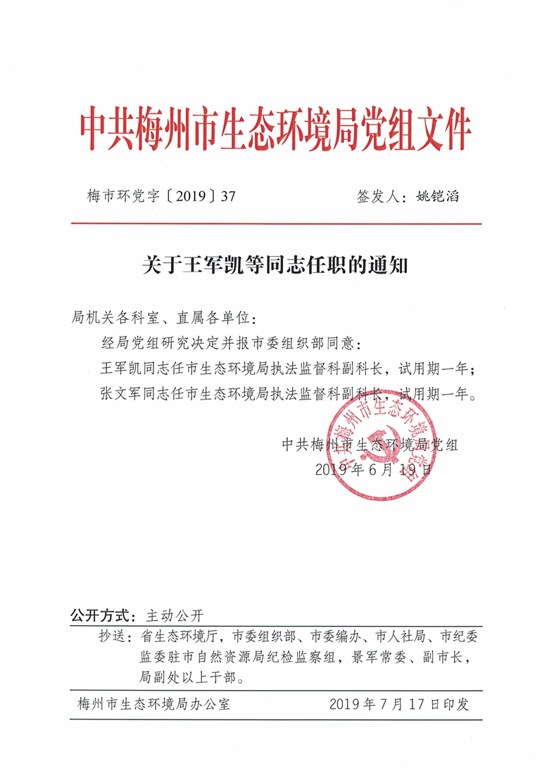 梅州市人民政府門戶網(wǎng)站 梅州市生態(tài)環(huán)境局 人事信息 關(guān)于王軍凱等同志任職的通知