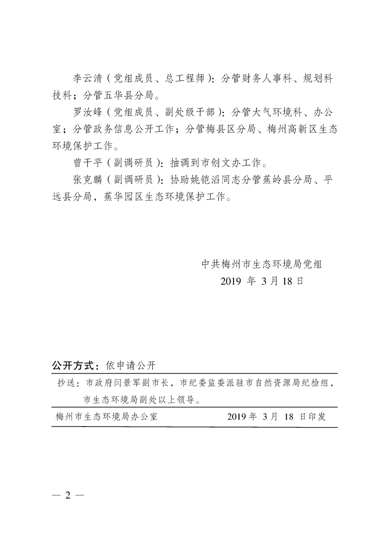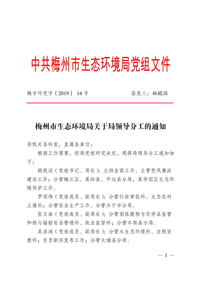 梅州市人民政府門戶網(wǎng)站 梅州市生態(tài)環(huán)境局 人事信息 梅州市生態(tài)環(huán)境局領(lǐng)導(dǎo)分工的通知